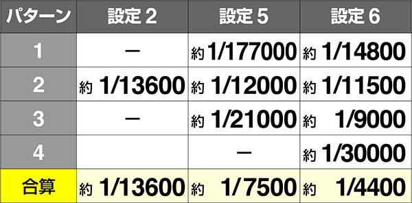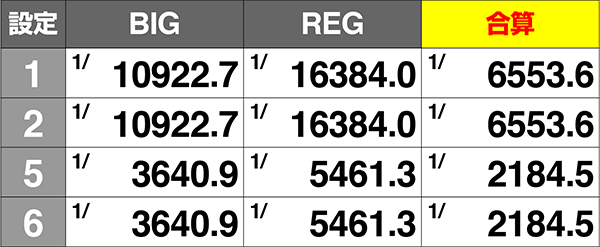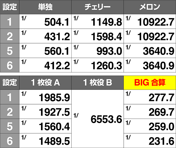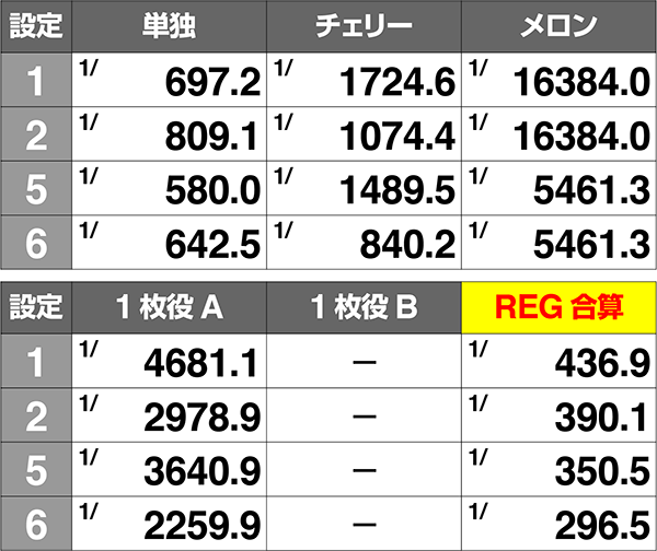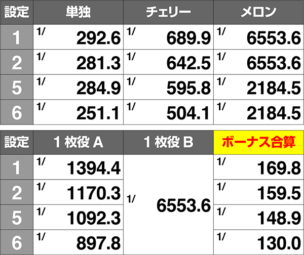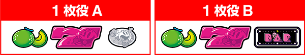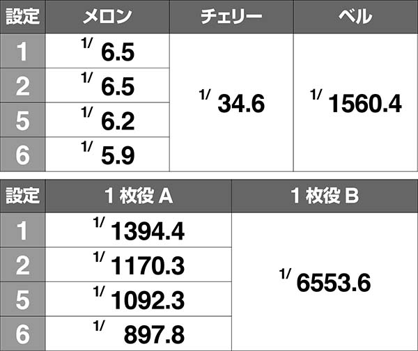 1枚役はどちらもボーナス確定。Aは高設定ほど優遇(とくにREG)、Bに設定差はなく、確率は1/6553.6でBIG確定だ。