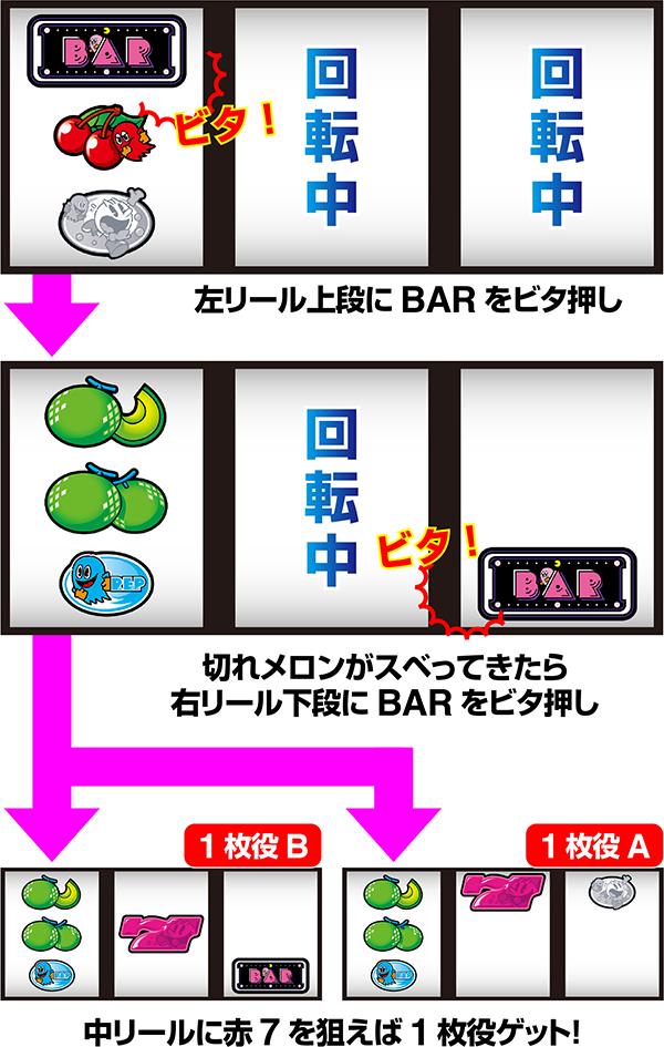 きっちり設定推測をおこないたいプレイヤーは1枚役を判別。ビタ押し2回が厳しい場合は確率の高い1枚役Aだけ狙って判別するのも可だ。