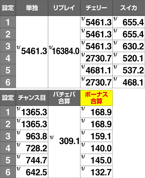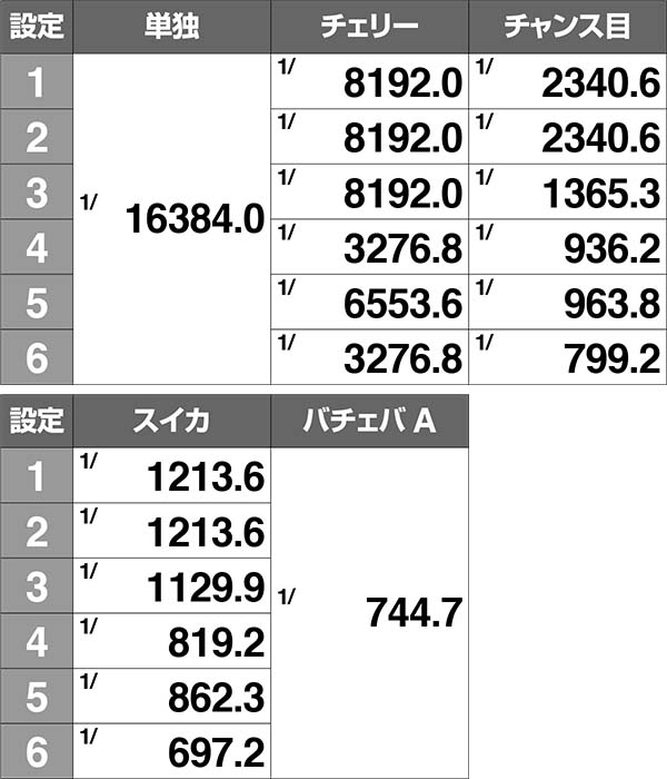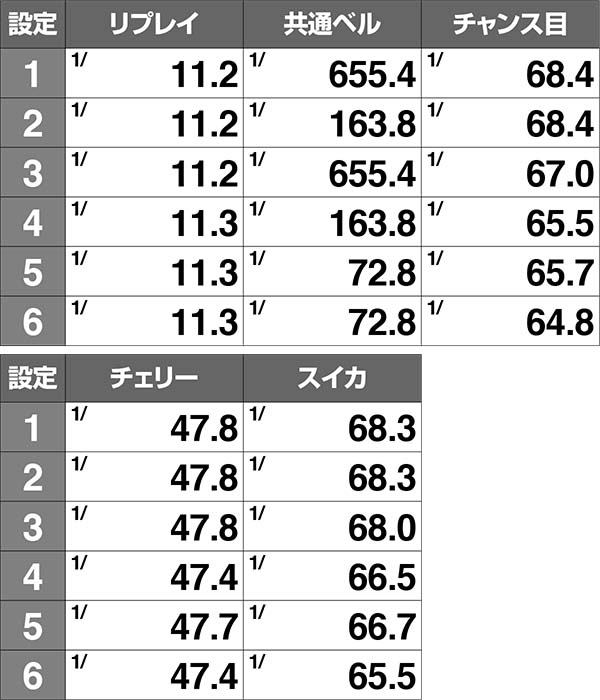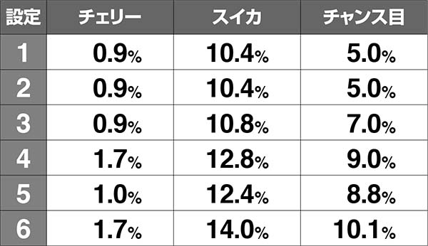 左リールに赤7・赤7・スイカを停止させる技術介入成功時のボイスで設定を示唆。パターンは4種類あり、デフォルト以外が発生すれば設定2以上が確定する。