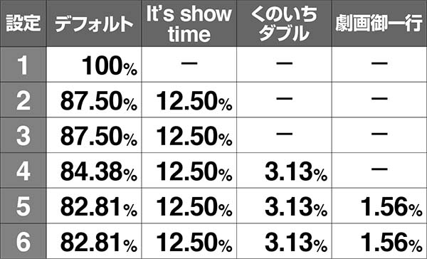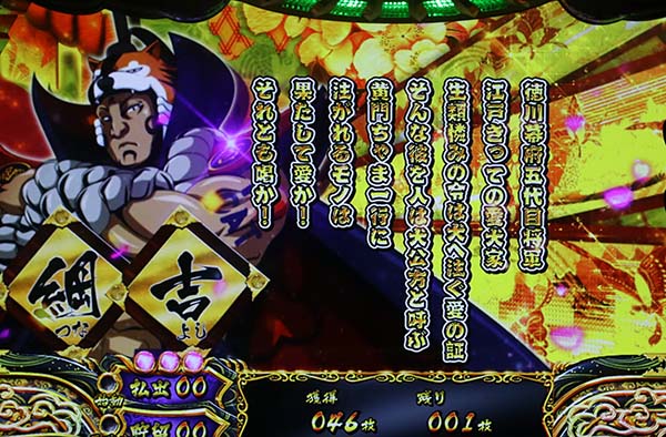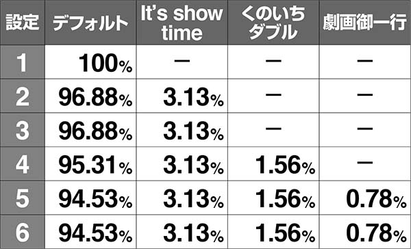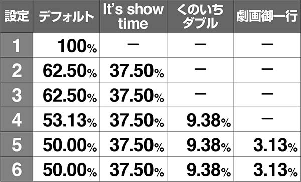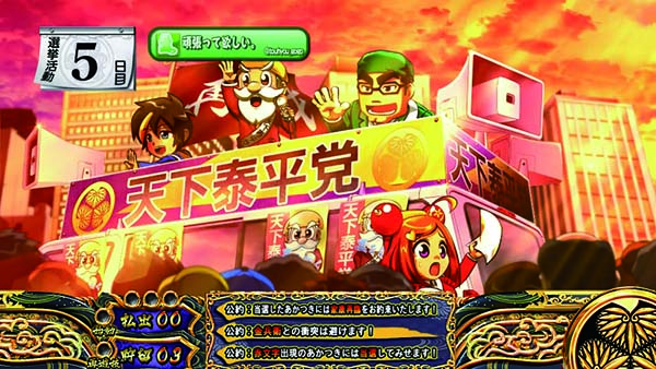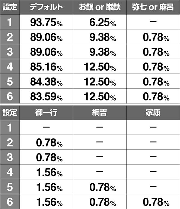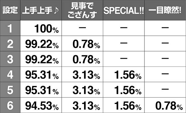 REG中は3種類あるシナリオの選択率と紹介されるキャラに応じて設定を示唆。黄門ちゃまからスタートするチャンスシナリオなら高設定に期待できる。シナリオに応じて異なる特定のキャラが出現しても高設定のチャンスだ。