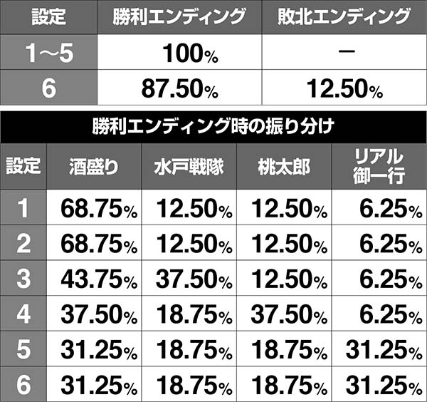 水戸革命中のモードに応じて完走時に出現する終了画面の振り分けが変化。スタンダードなら設定の奇偶判別に特化、完全告知は設定4以上なら高設定確定パターンが40%で出現するというようにモードごとに面白い特徴がある。