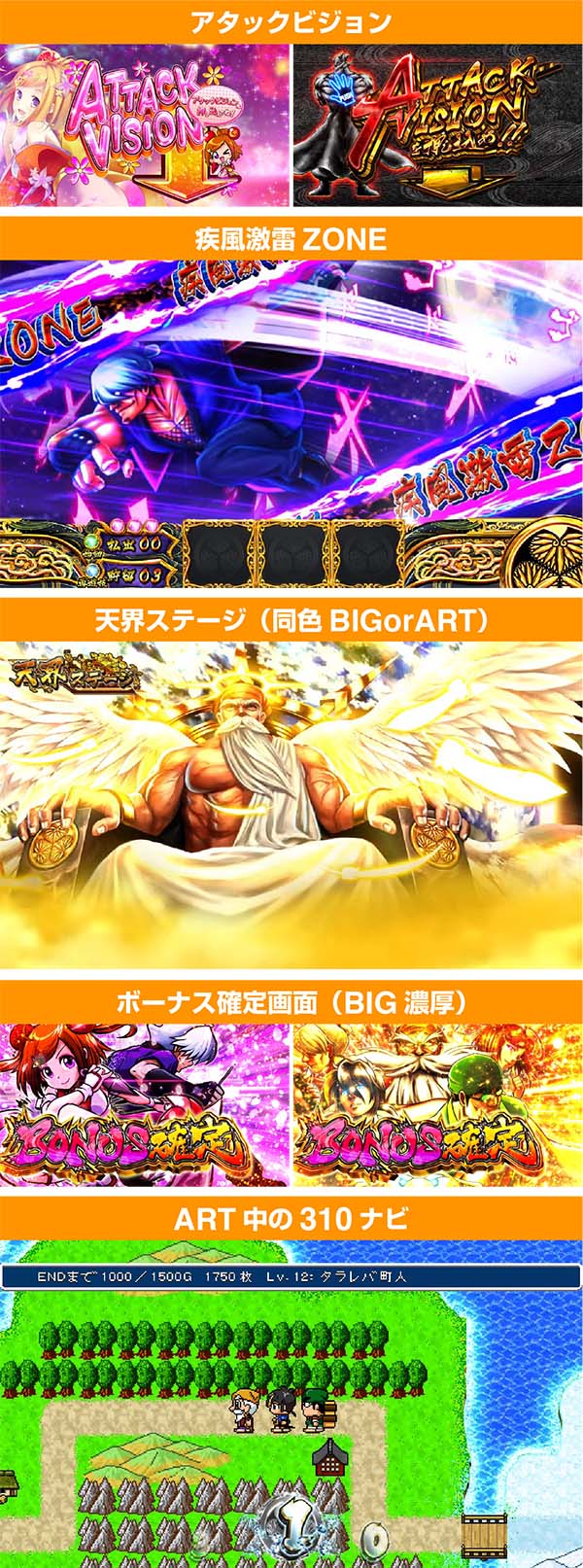 前作から笑撃的進化を遂げた「パチスロ黄門ちゃまV」がボーナス+ARTタイプとして登場。 通常時はボーナスやCZを契機にARTを目指すゲーム性だ。 出玉増加の軸となるART「水戸喝ラリー」は1Gあたりの純増約0.8枚の初期ゲーム数変動型。前作の印籠チャンスを継承した選択式上乗せ特化ゾーン「ハンマープライス」など、一撃性を秘めた笑撃のトリガーが再び黄門ちゃま旋風を巻き起こす。 |