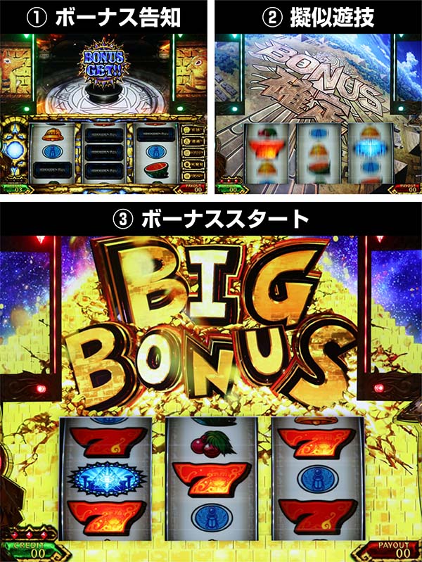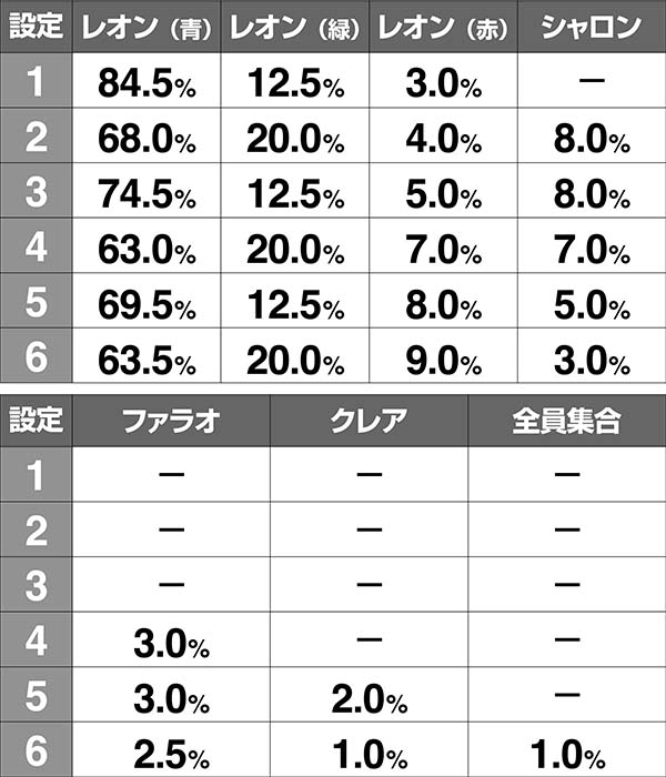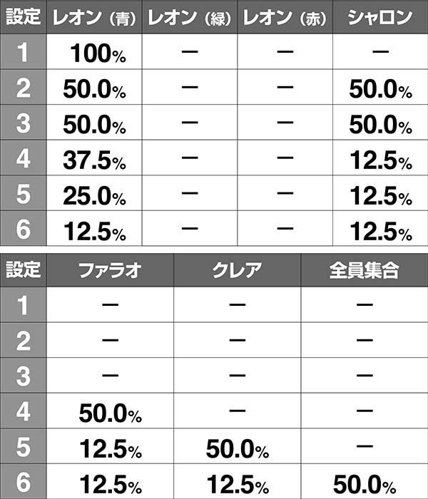 レオン&メジェドは最初から画面内におり、ビタ押しを成功するごとにシャロン→ハルト→マーヤ→オヤジの順で増えていく。オヤジの登場までに最短で4Gかかるので、判別に使えるのは最長で5G目からボーナス終了までの25G間だ。