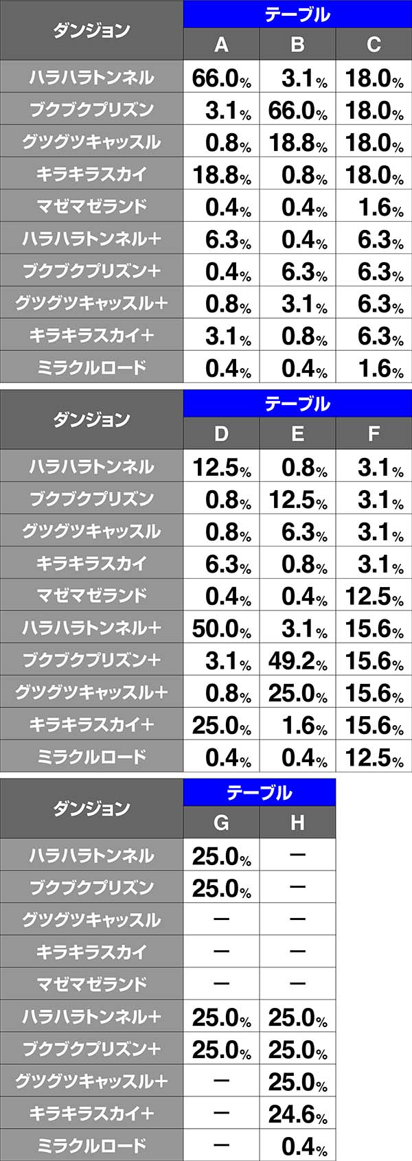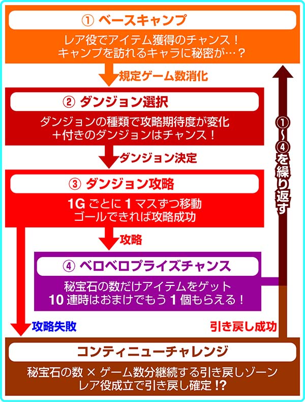 ダンジョンの攻略数に関係なく、問答無用で有利区間の完走が確定する2つの条件が存在。どちらか1つでも達成できれば、有利区間完走確定だ。そうそう達成できることではないが、早めに引けたら大量出玉はもう目の前!