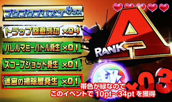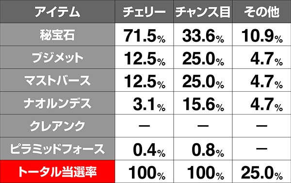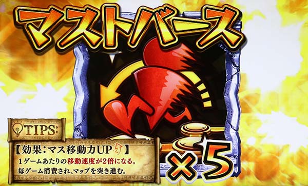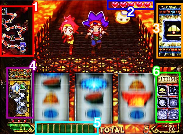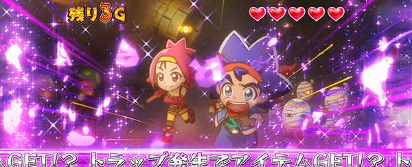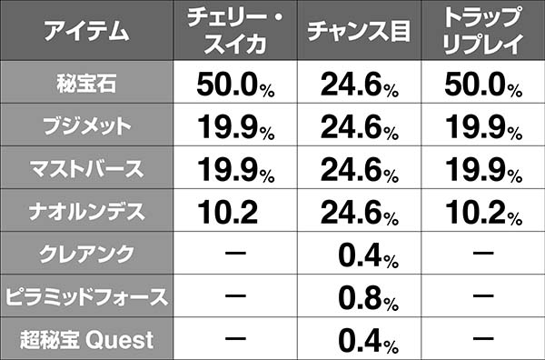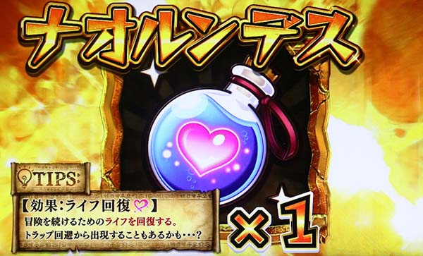 トラップリプレイ成立(デンジャートラップ演出発生)でアイテム獲得確定。レア役成立時もアイテム獲得が確定する。