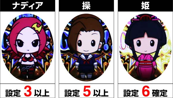 ナディア(SHAKEシリーズ)、操(番長シリーズ)、姫(吉宗シリーズ)が出現すると特定の設定以上が確定。