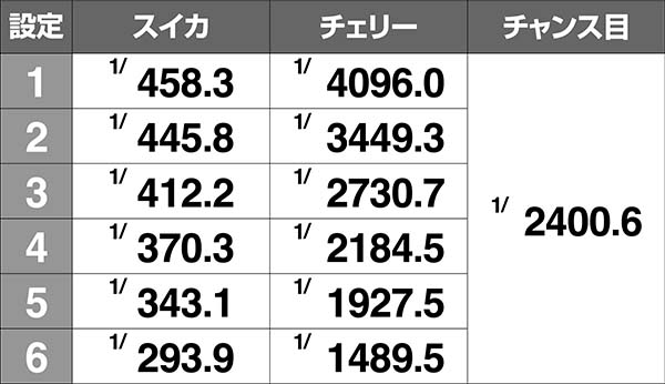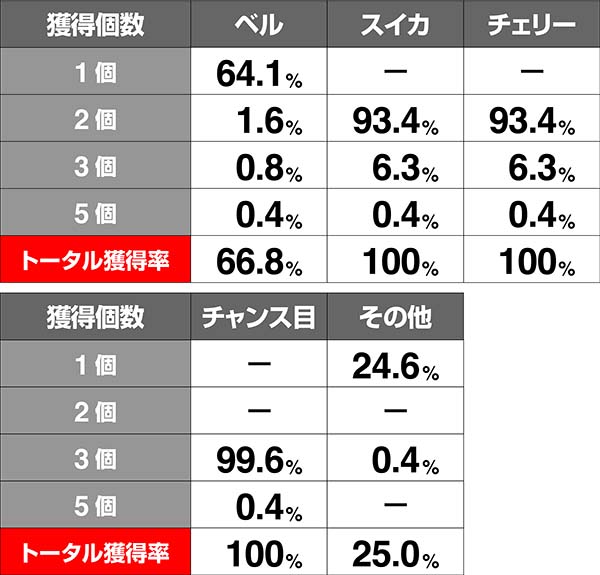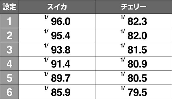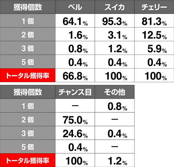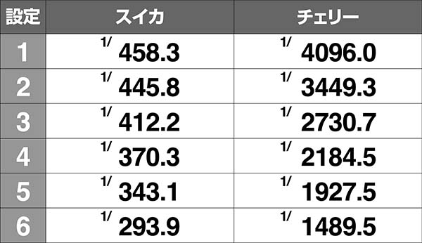スイカとチェリーは確率、同時当選期待度ともに高設定ほど高いので、単純に高設定ほど引きやすいと考えてOK。