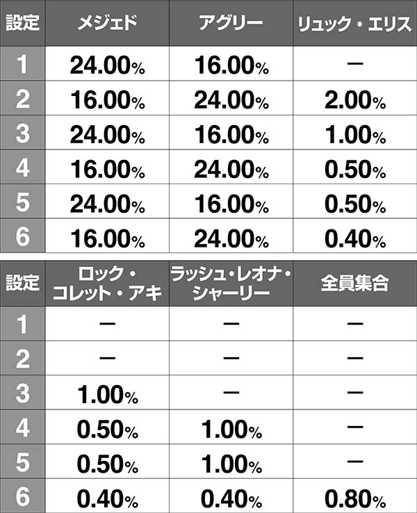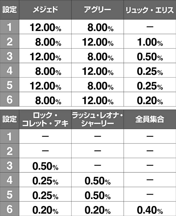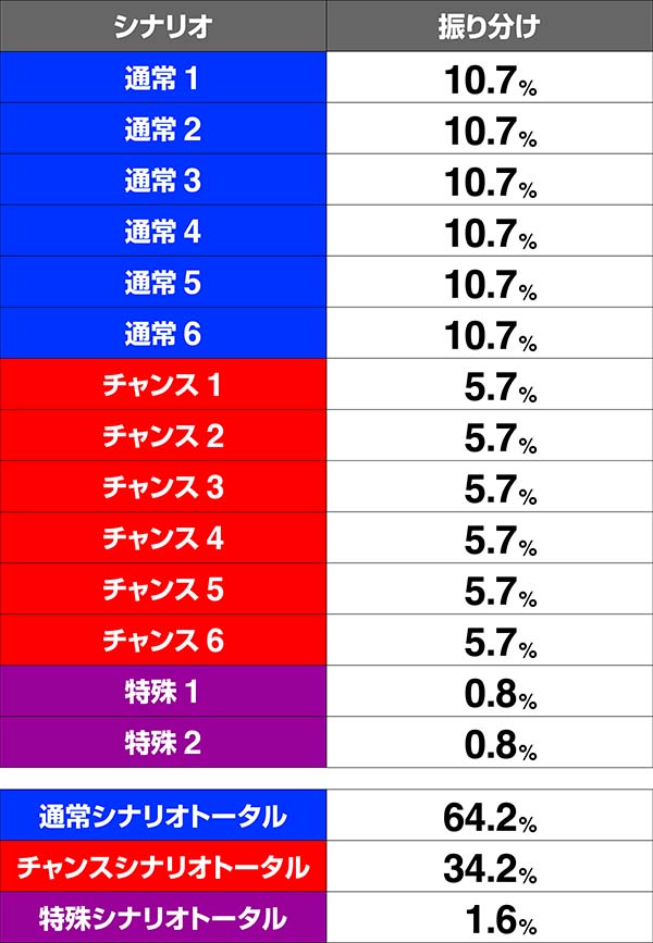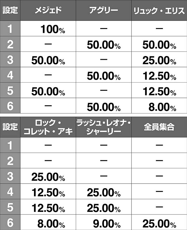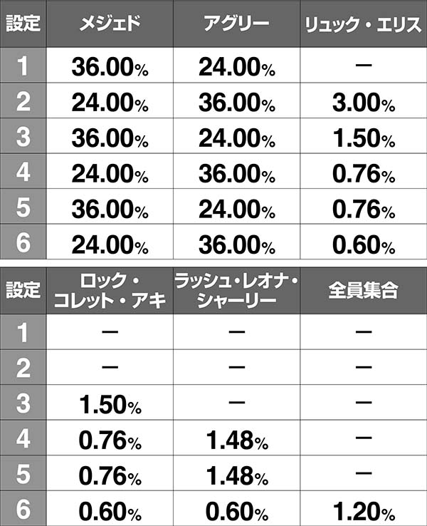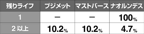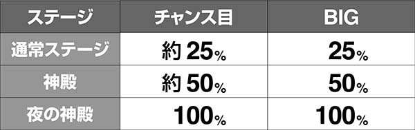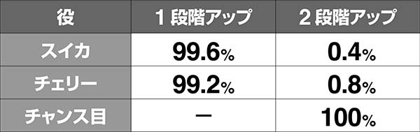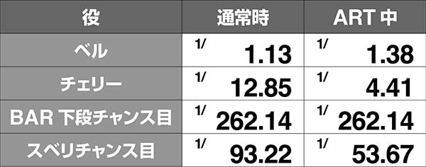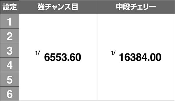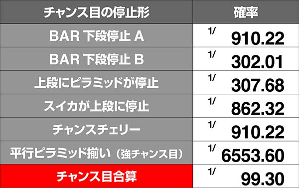 チャンス目は確率、同時当選期待度ともに設定差がなく、ボーナス当選時は有利区間へ移行。有利区間中のボーナスはBIGになるので、チャンス目と同時当選したボーナスはBIGが確定する。