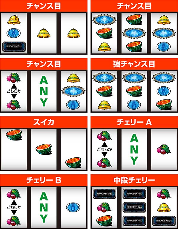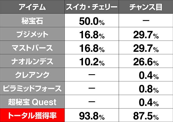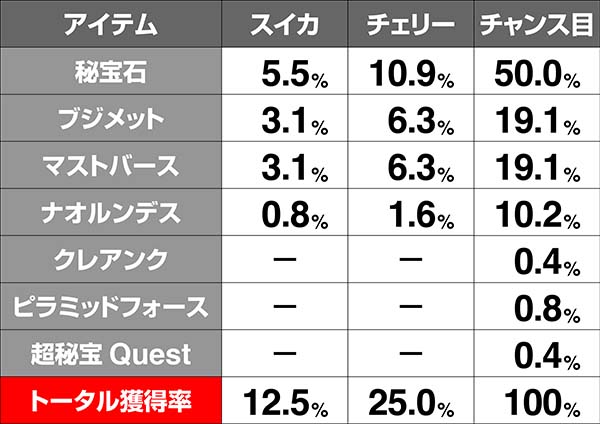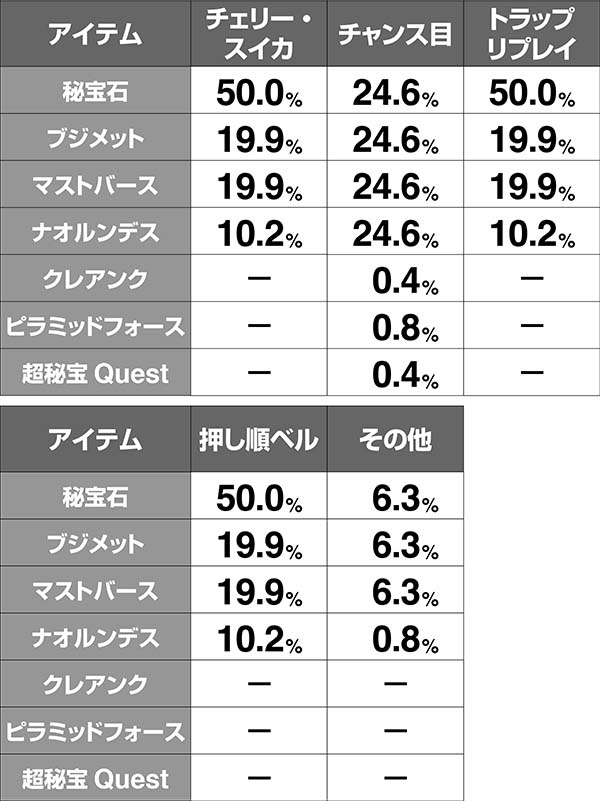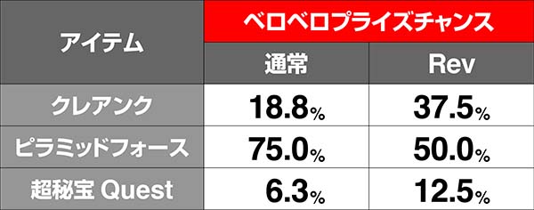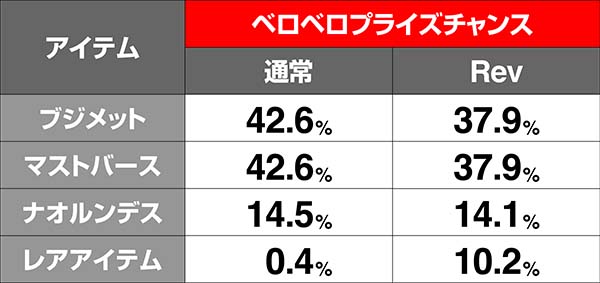 Rev中はレア役だけでなく、押し順ベルでも獲得確定。リプレイでも獲得のチャンスがあるので、毎ゲームのアイテム獲得期待度は約20%以上となる。