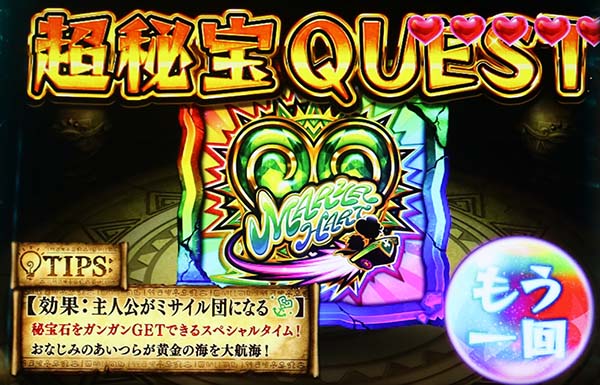 50G終了後に継続抽選をおこない、当選時は10G延長。継続率は50%と90%の2種類があり、超秘宝Quest突入時に振り分けられる。