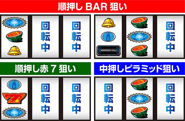 MID中は、左リールに赤7/ピラミッド/赤7をビタ押し。成功するたびにキャラが増える可能性があり、オヤジまで登場したら、その次のビタ押しから設定推測が可能になる。