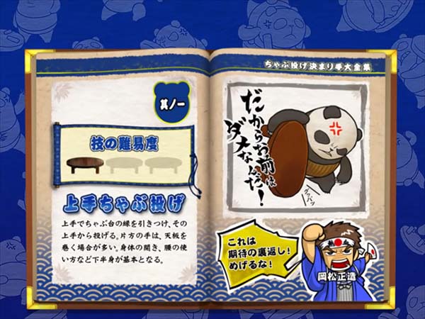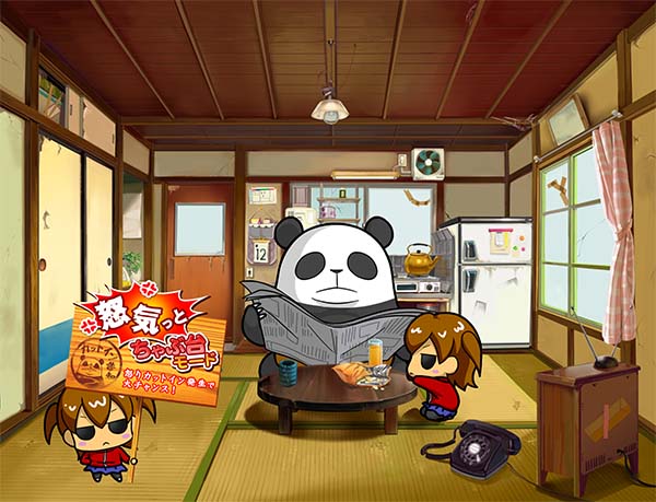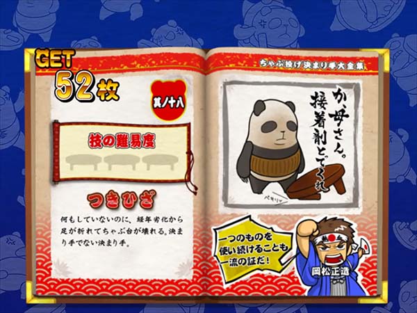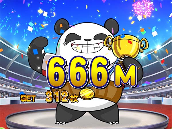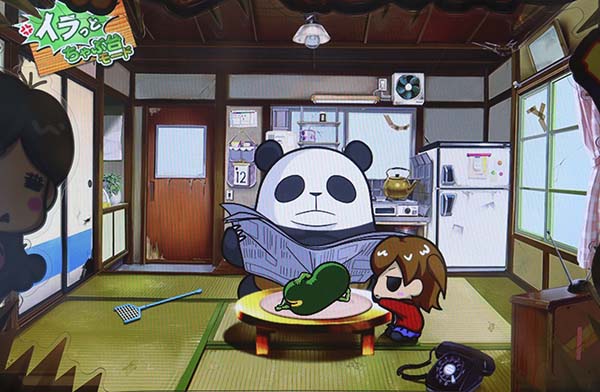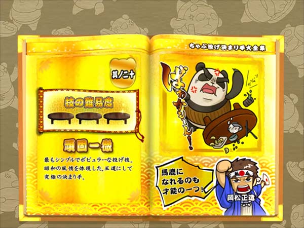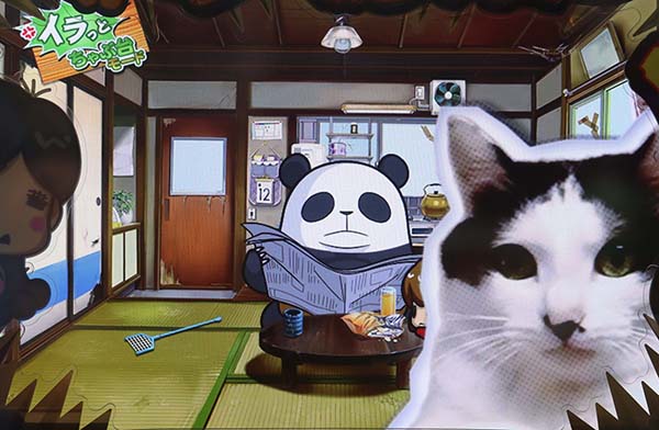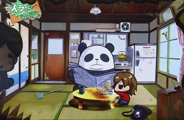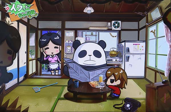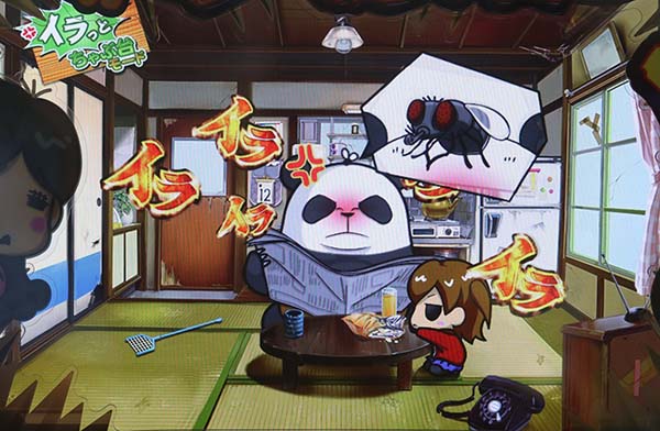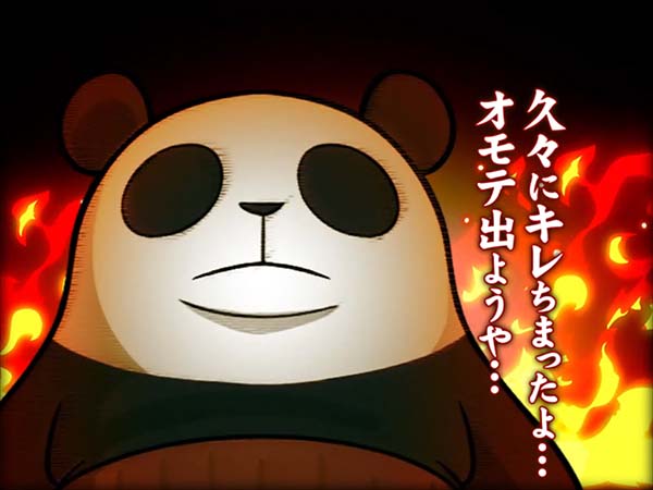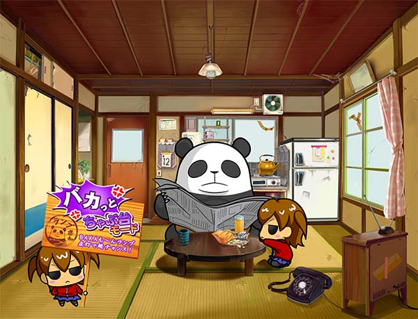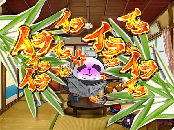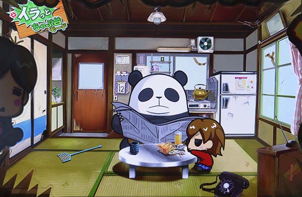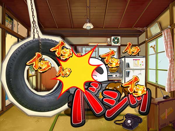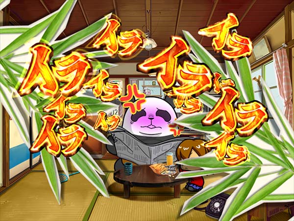 「まめ」に続くインパクトAタイプの第2弾となる「ちゃぶ台返し」。 ボーナスの獲得枚数はBIGが312枚、REGが104枚。いずれも技術介入一切なしで消化できるところがポイントといえる。 ボーナス当選時は完全告知。お父さん(パンダ)がちゃぶ台をひっくり返すという衝撃の告知を筆頭に、光ればボーナスとなる「BAKAも〜んランプ」などユニークな演出が豊富に搭載されている。 |