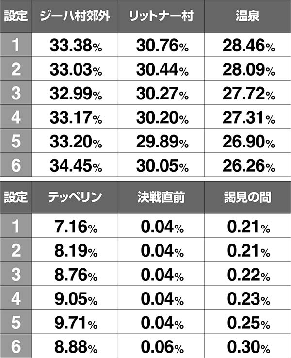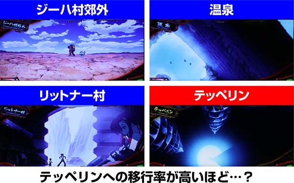 RT終了後は示唆内容が異なり、高設定ほど移行しにくいのが特徴だ(RT後はジーハ村郊外とテッペリンのいずれかに移行)。