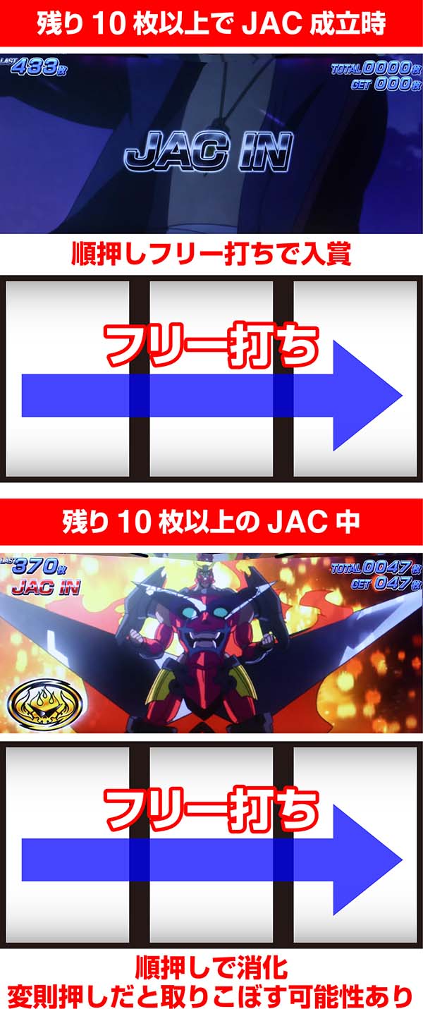 BIGの残り枚数が9枚以下になったタイミングでJACをハズすと、アイキャッチが出現。BIG終了までJACをハズすたびに何度でも出現するが、1度でもハズシをミスすると同一BIG内では出現しなくなる。