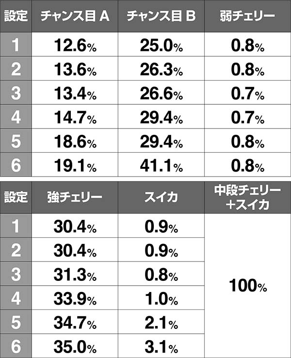 レア役では、比較的差の大きいチャンス目B確率が設定推測に使える。