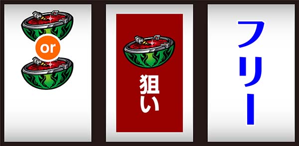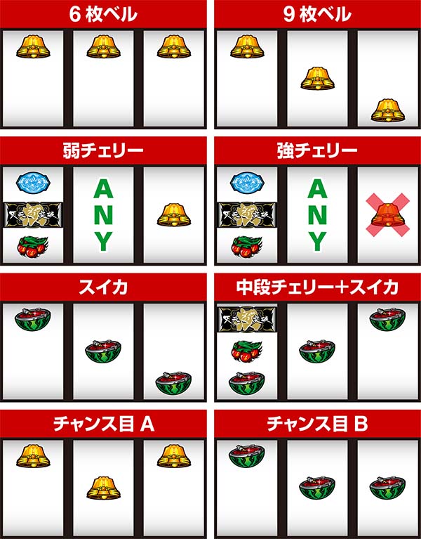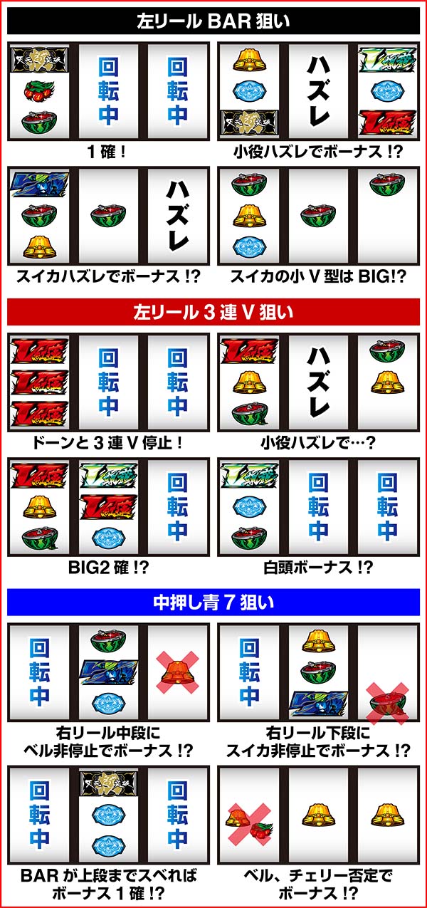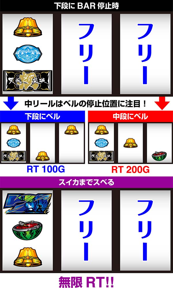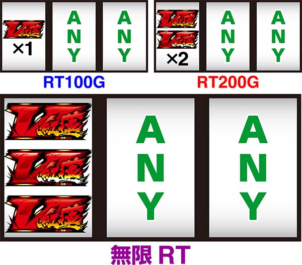 ボーナス後にRTに突入するボーナス+RTタイプ。RTは100G、200G、無限の3種類があり、RT突入時の出目でRTのゲーム数がわかる。BIGは約308枚獲得できるので、RTとループすれば大量出玉の獲得も十分に可能だ。 ボーナスは残り10枚未満(フリーズ+暗転)になったら逆押し3連V狙いを終了まで実践しよう。 |
