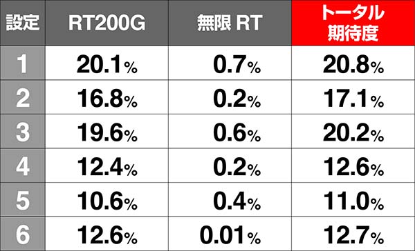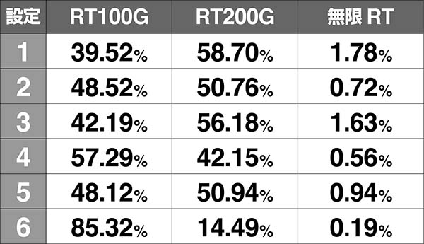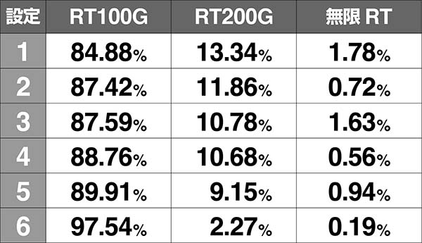 設定6はRT200Gの比率がかなり低いため、複数回200Gを引いた場合、設定6の可能性が下がってしまう。