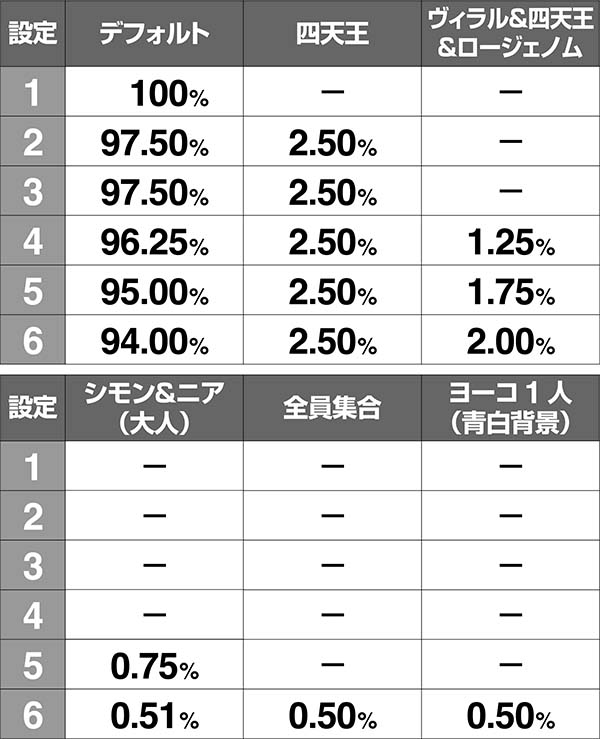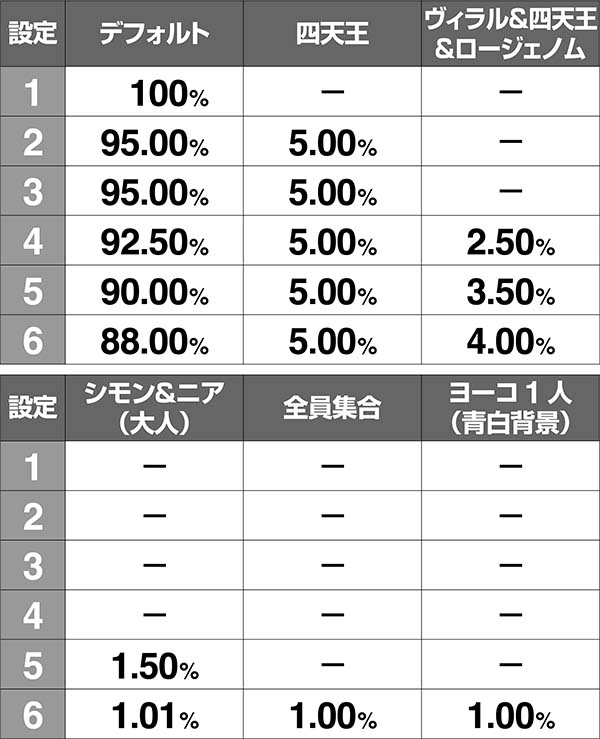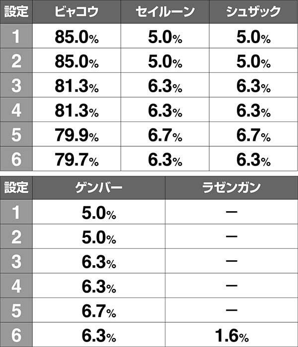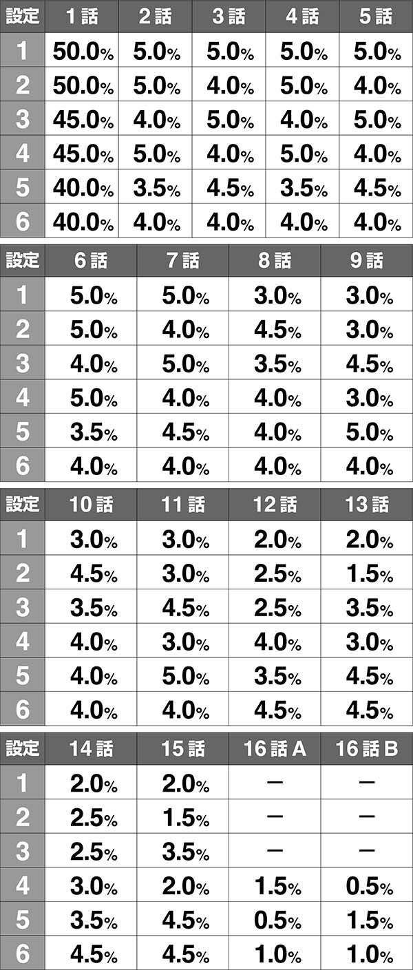 アニメの奇数話が奇数設定、偶数話が偶数設定を示唆する(1話はほぼデフォルトとして出現)。設定4以上濃厚となる16話以外は大きな差がないので、そこまで気にしなくても問題ない。