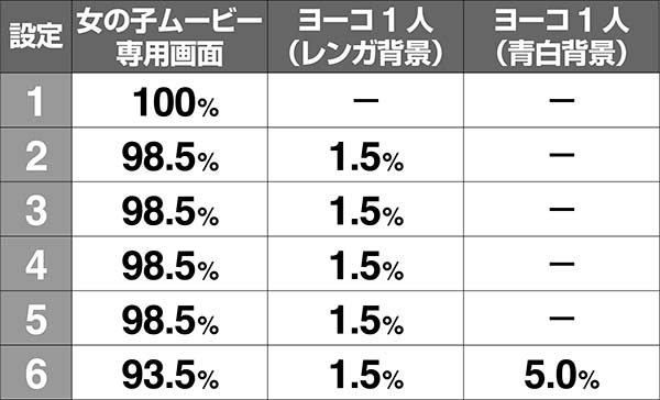 ・ヨーコ1人(青白背景)…設定6濃厚