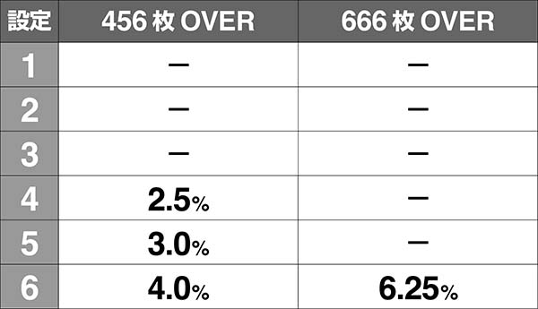500枚突破時に456枚OVER、1000枚突破時に666枚OVERが出現すれば、高設定濃厚だ。