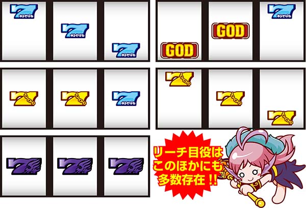 サブ要素としてリーチ目役もチェック。黄7揃い以外の15枚役はすべてリーチ目役となる。