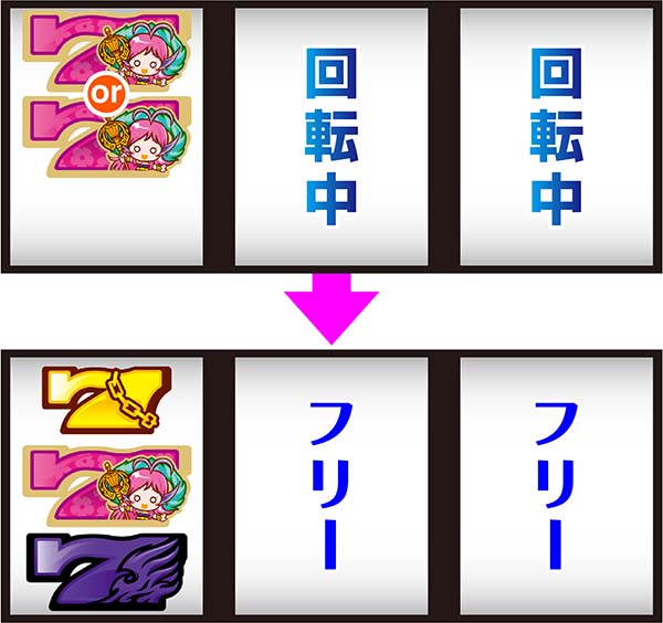 右上がり黄7や中段黄7はボーナス同時当選に期待。紫7揃いはBIG以上確定だ。