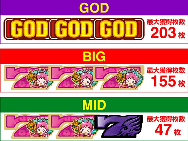 通常時は基本的に確率の高いBIGとMIDを引きながらGODを目指し、GOD後に移行するRT中のボーナスでまとまった出玉を作るという流れがメインのゲーム性。もちろんGODなしでも、ボーナス連打で出玉を増加させることは可能だ。