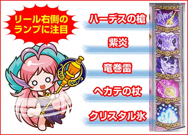 枚数アップ手順成功後はリール上部の松明ランプも点灯する。