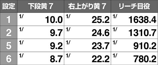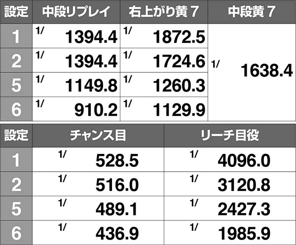 中段黄7時は設定差がないので除外してOK。リーチ目役契機のMIDは高設定のチャンスとなる。