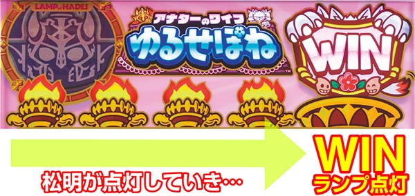 ゴッドシリーズのセット数上乗せのように『ピルピル』という効果音とともに左の松明から点灯していき、最終的にWINランプが点灯する。