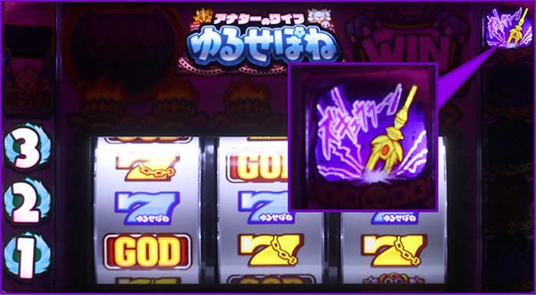 WINランプが点灯した次ゲームで小役が成立していた場合、ボーナスは揃わないのだが、このタイミングで再度告知が発生すればBIG以上確定。さらに次のゲームでも告知が発生すればGOD確定となる。