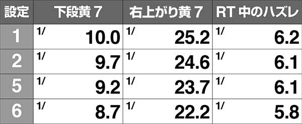 通常時は下段黄7と右下がり黄7をカウント。どちらも設定差が大きいため、推測要素としてはかなり強力だ。