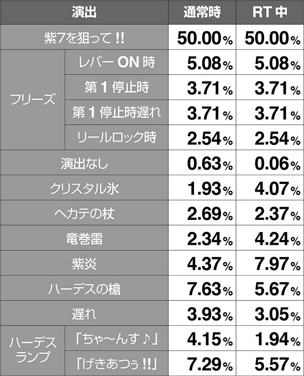RT中は紫7フェイクが出やすいため、『紫7を狙って!! 』自体の発生率がアップ。そのぶん、演出発生時の紫7揃い期待度は通常時の50%に対して37.1%とやや低くなる。