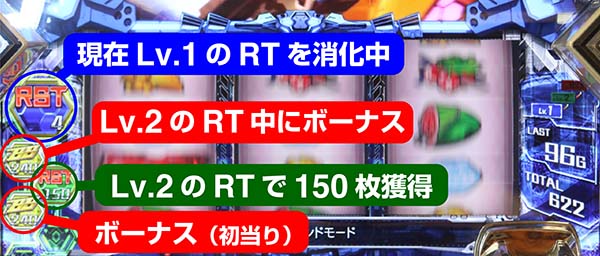 例えば、Lv.MAX中に当該状態に移行した場合、最大200G消化後にボーナスが告知される。