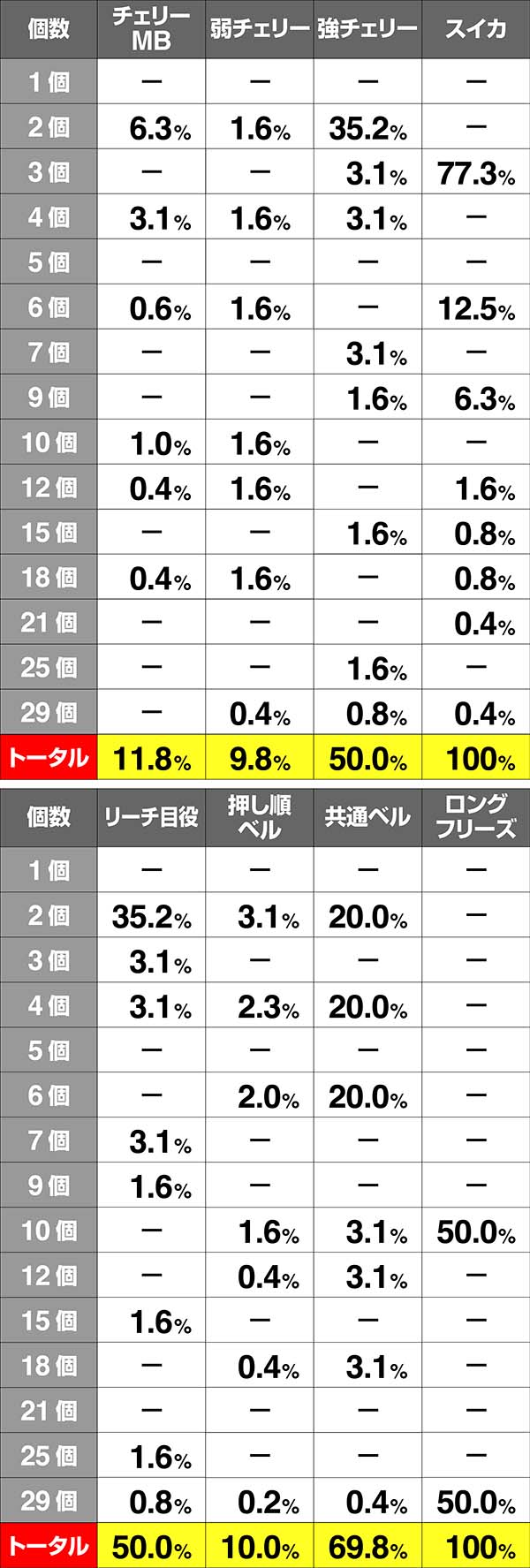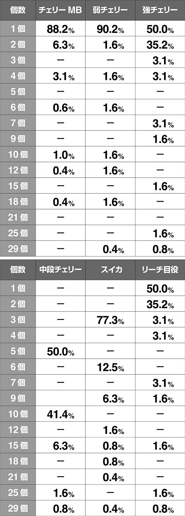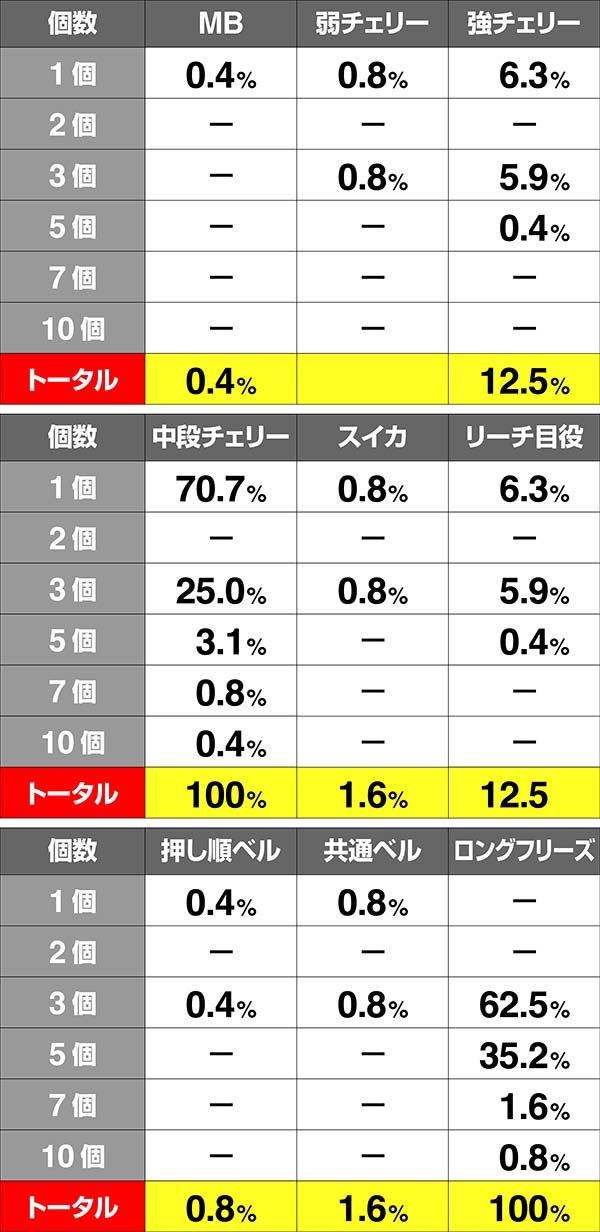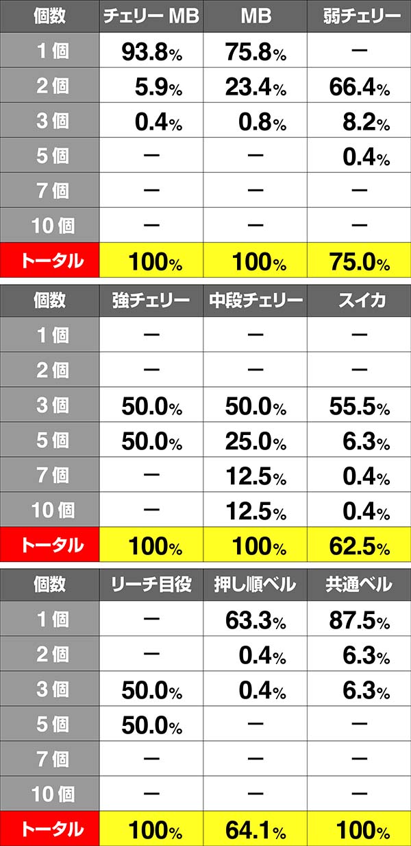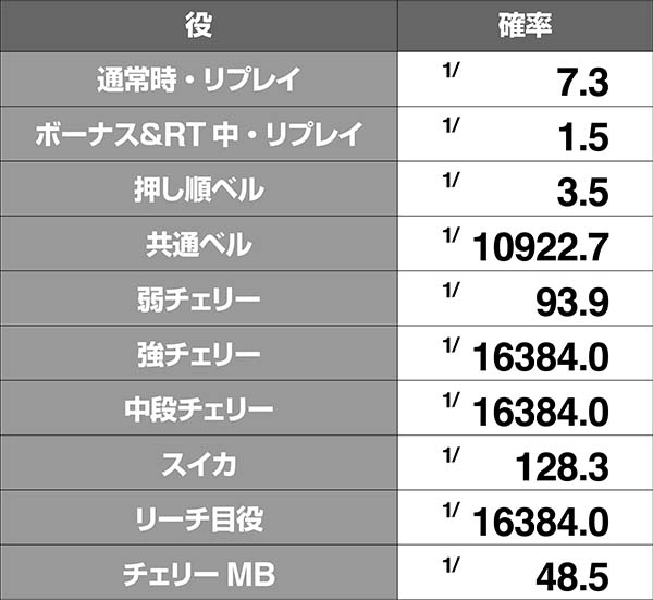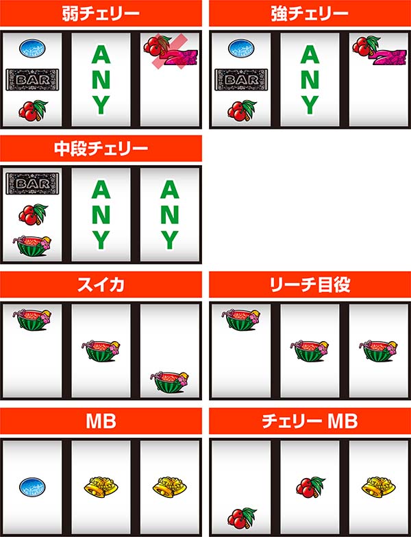 右リール上段にチェリーor赤7停止で強チェリー(狙えば3連チェリーが停止)。