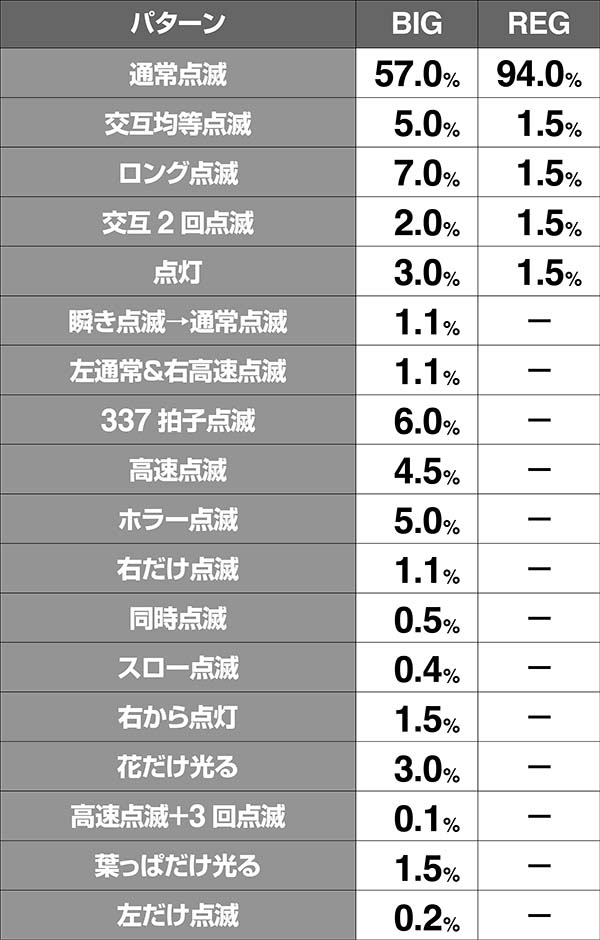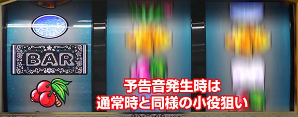 レバーON時に予告音が発生したらレア役の可能性があるので、通常時と同様の小役狙いで消化しよう。レア役成立でボーナスストックのチャンスだ。