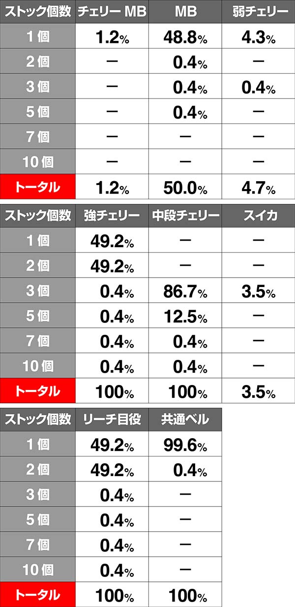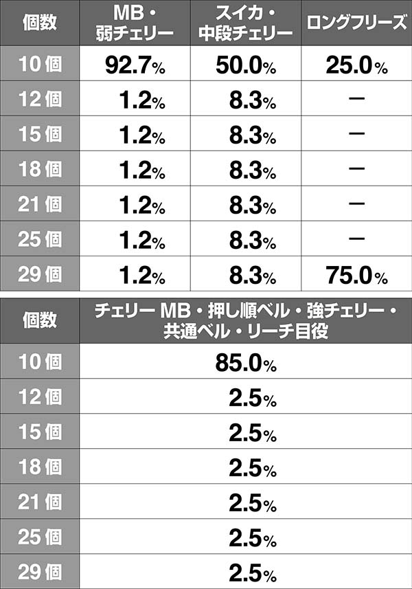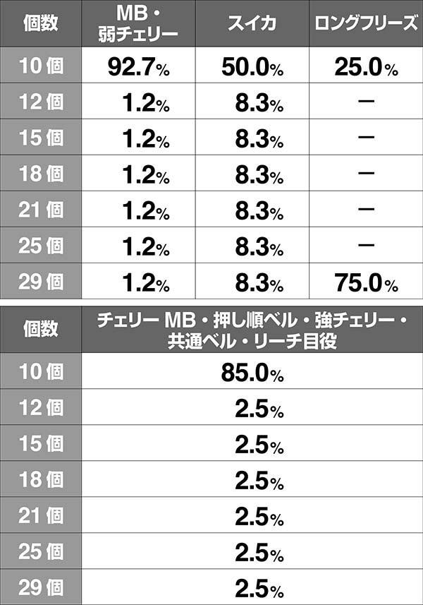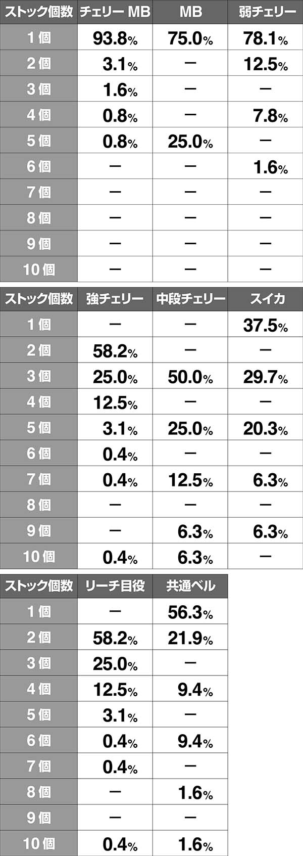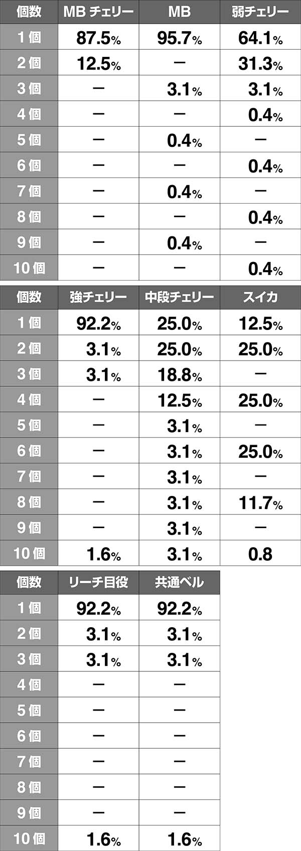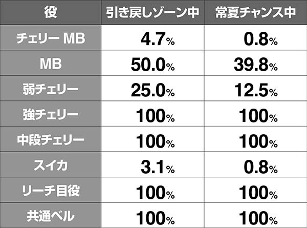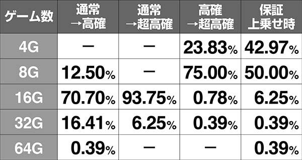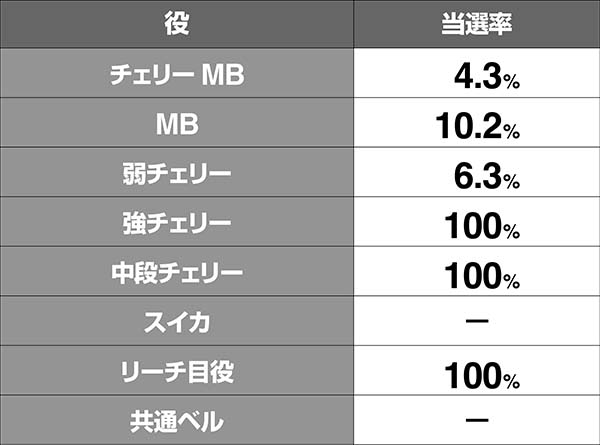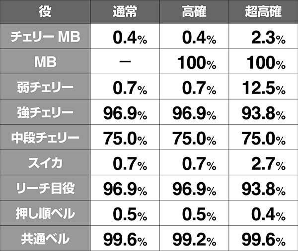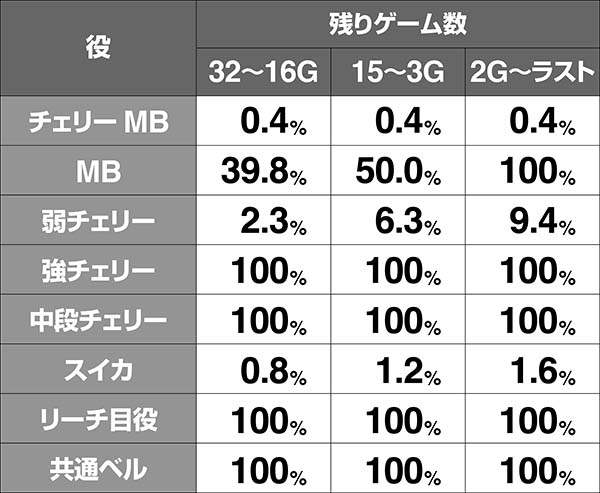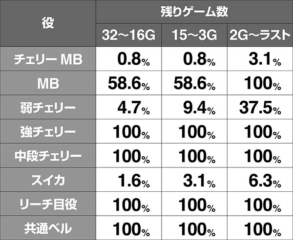昇格の契機となるのはチェリーMBで、成立時は高確以上へ移行。移行時に獲得する保証ゲーム数+消化中のレア役で上乗せした分を消化し終えると、通常へ転落する。