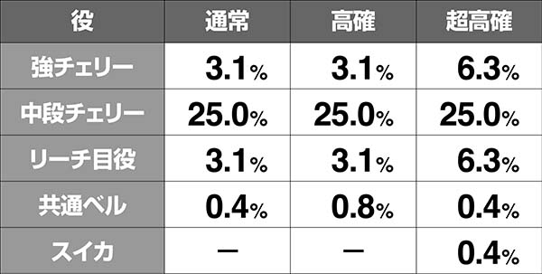 通常時は通常、高確、超高確と3つの内部状態(有利区間)があり、上位の状態ほどレア役成立時のボーナス当選率がアップ。