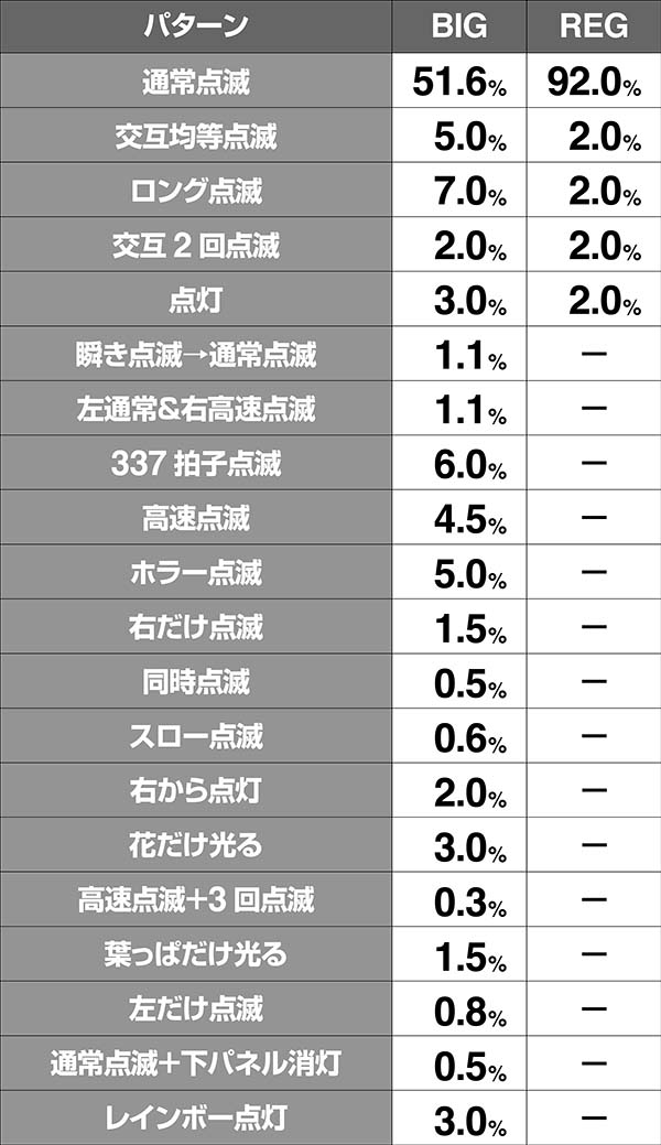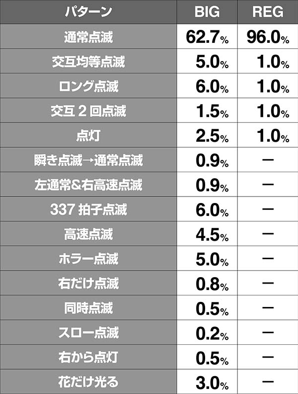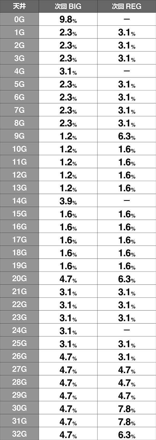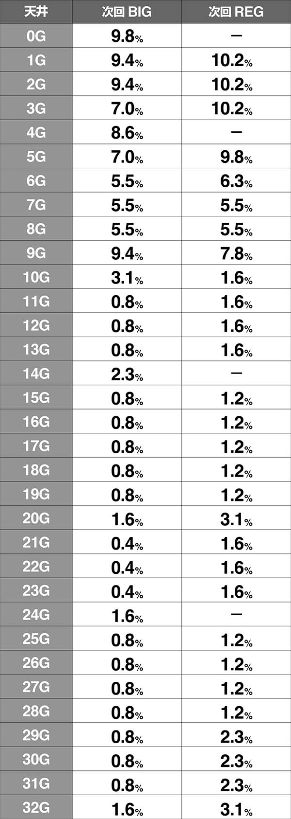設定変更時とそれ以外で割合が変化し、設定変更後1000G以上ハマった場合のBIGでは奇数or偶数or設定4以上をかなりの高確率で判別できる。