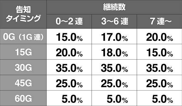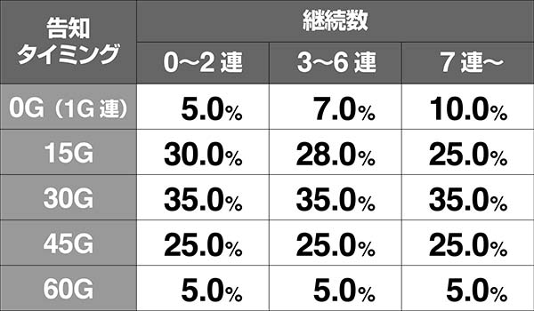 長く継続しているほど1G目に告知されやすく、頻度としては30G目の告知がもっとも多い。