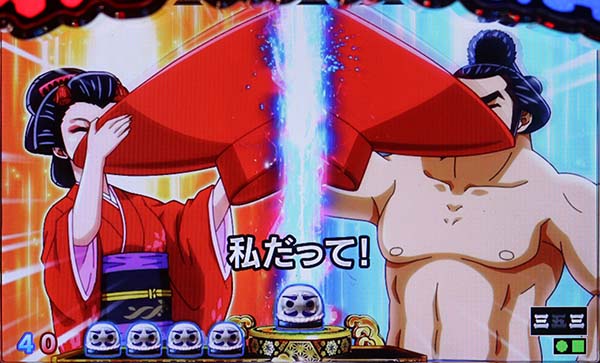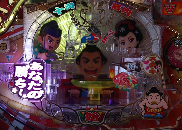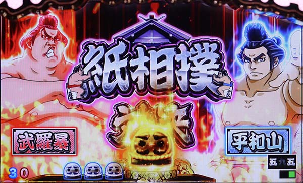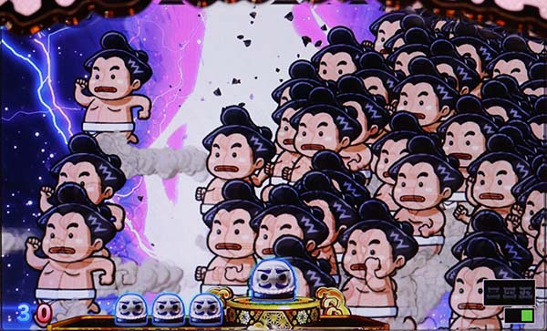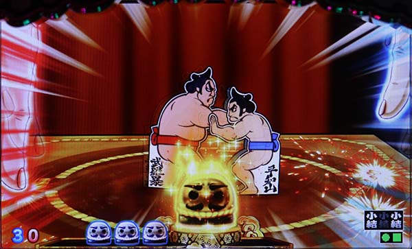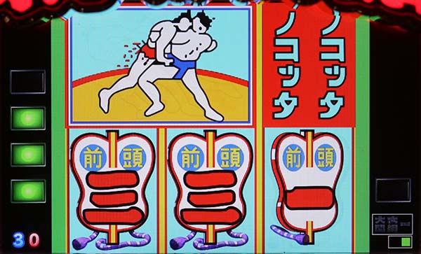順目以上でリーチ、ケツテンパイ(中・右図柄が同一図柄)でノコッタ発展濃厚、十金小(左から十両・金星・小結)は大当り濃厚となる。