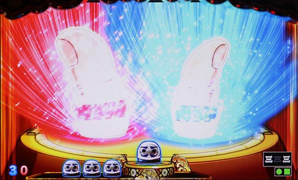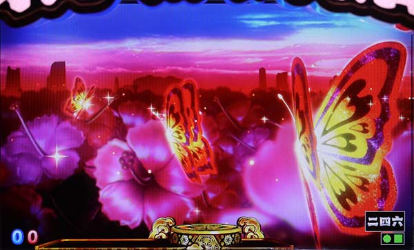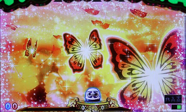赤系チャンスアップが2箇所に発生で期待度30%超。金系は他のリーチと同様に大当り濃厚だ。