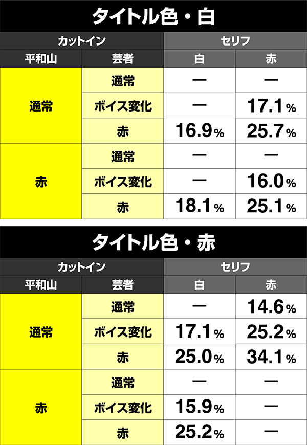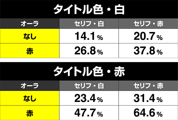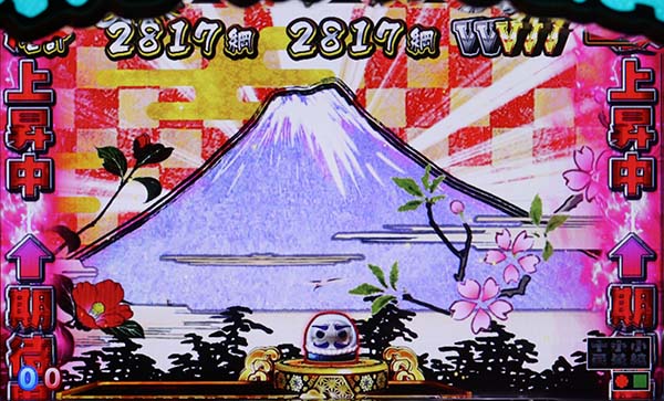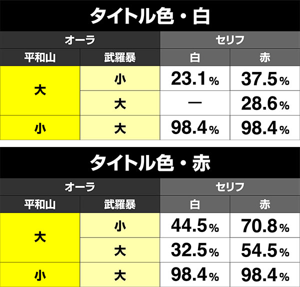 平和山のオーラが小なら期待度98%オーバー。金系チャンスアップは大当り濃厚となる。イルミなしだと平均期待度は10.8%となるだけに、イルミの発生にも注目しておきたい。