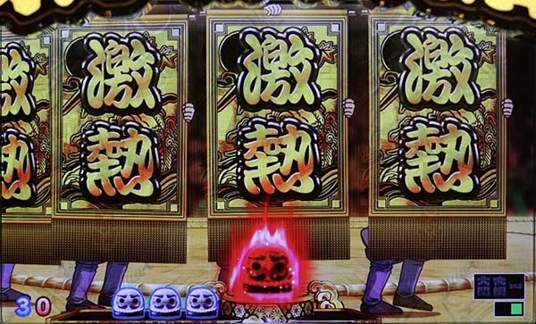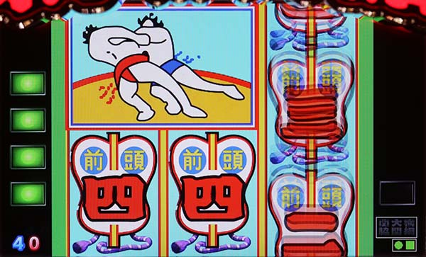 左と中に同じ図柄が止まればリーチ。テンパイ図柄が七や大関なら大チャンスだ。