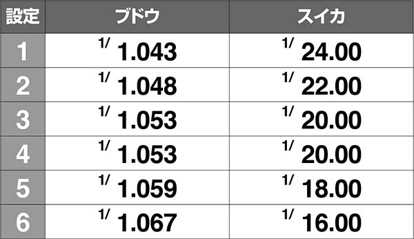 BIG中はスイカ成立時に必ず告知音が発生。入賞させると枚数的に損をしてしまうため、ハズした上でカウントしよう。設定差はそれなりに大きく、高設定ほど確率が高い。