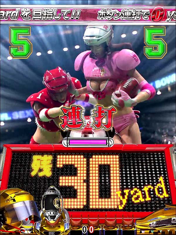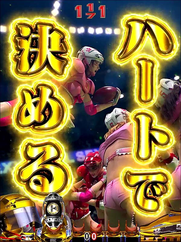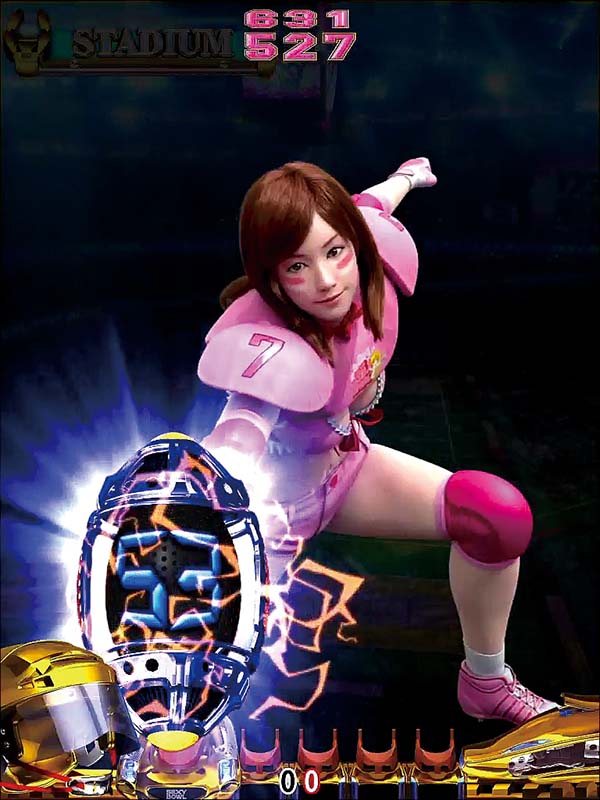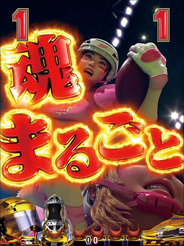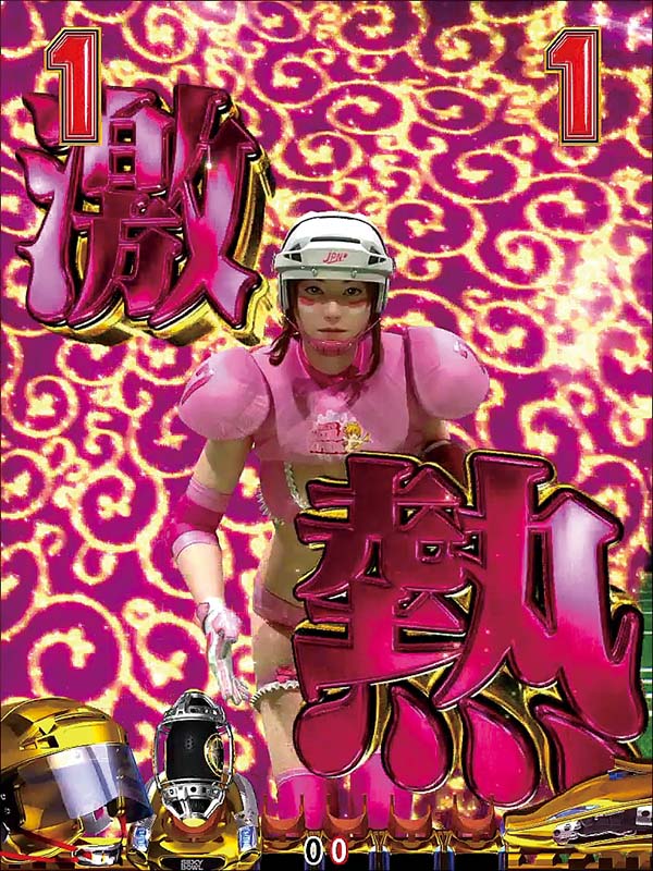 最強アメフト女王の座をかけたセクシーな戦いが開幕!! 1種2種混合タイプとなっており、時短回転数は100回転と1回転の2種類。100回転であれば実質的に連チャン濃厚、1回転の場合でも引き戻し率は最大約43%(残り保留4個を含む)と、継続する楽しさも味わえる仕様となっている。 迫力満点の3D液晶とダイナミックな役モノも必見。野獣ボブ・サップと人気声優陣による白熱の演出からも目が離せない! |