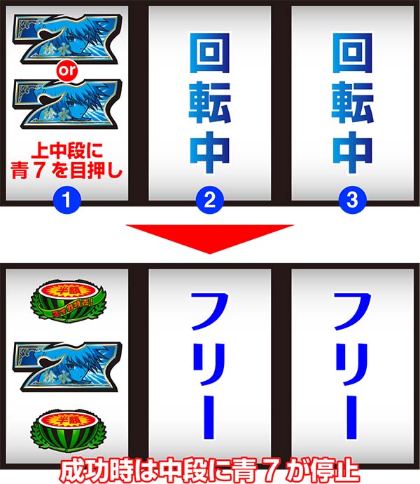 赤7単独当選は成立ゲームで中段チェリー(リーチ目)が停止するため、キチンと小役狙いをしていればほぼ完璧に見抜くことができる。