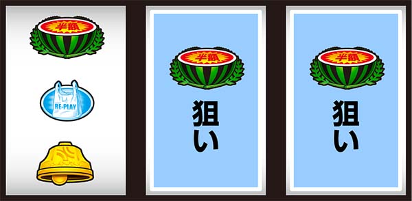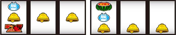 中段に揃うベルは通常ベル、左リールがスイカまでスベって下段に揃うのがスベリベルだ。