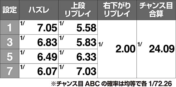 通常RTでは上段リプレイ、無限RTでは中段リプレイ確率が低設定ほど高く、高設定はハズレが多い。