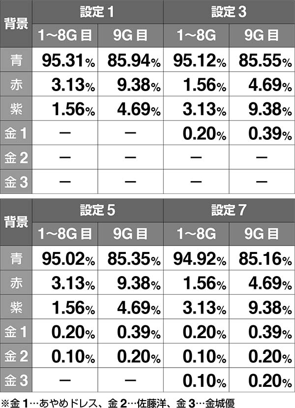 金1(あやめドレス、着ぐるみ神)…設定3以上